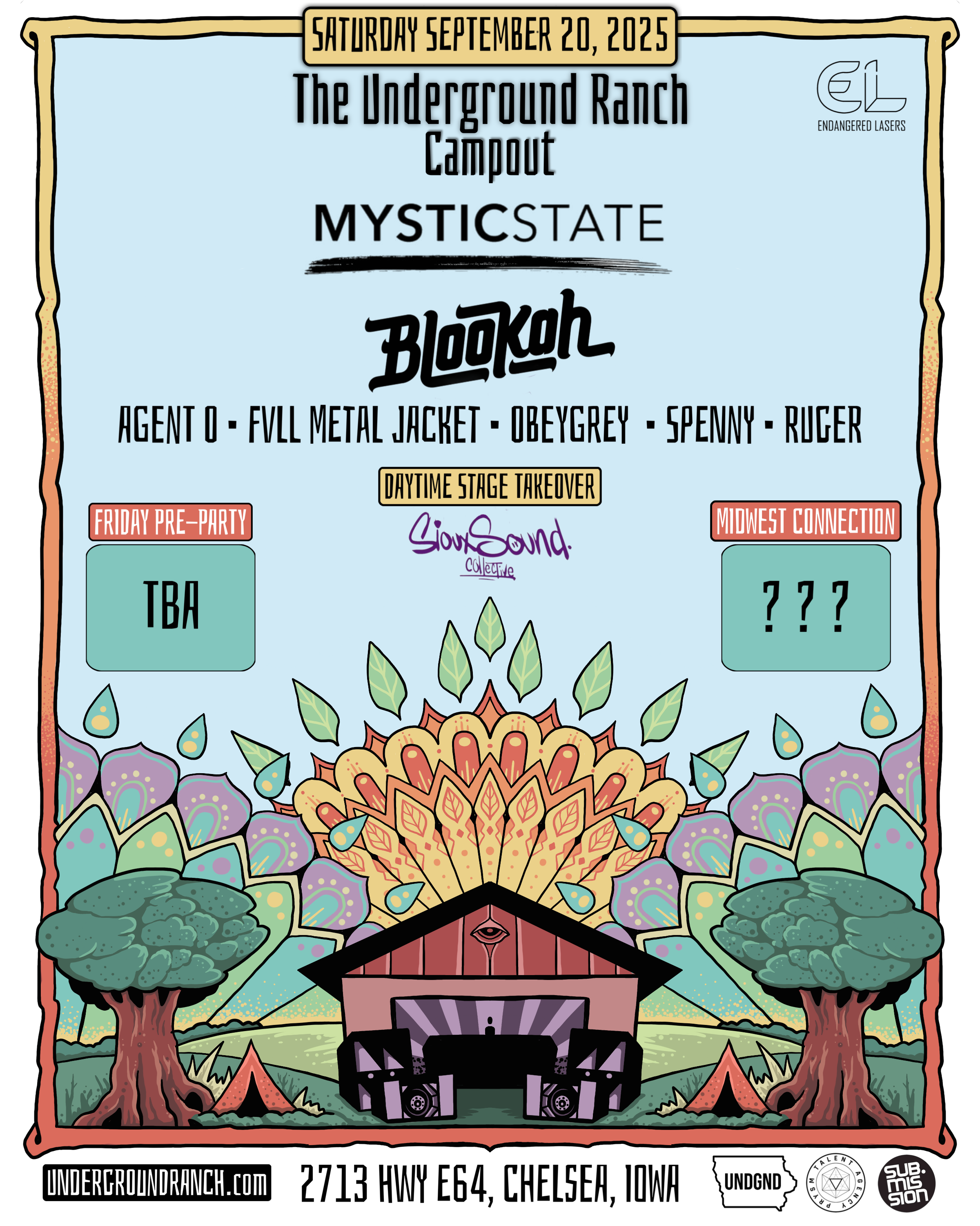 A campout at “The Underground Ranch” brings sound system culture in the barn & fields for a rain or shine event highlighting an eclectic mix of Eletronic music from here at home and around the world.